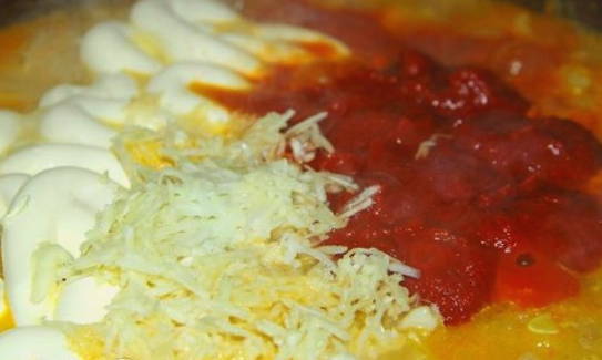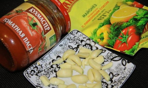 - We vullen de massa aan met knoflook, mayonaise en tomatenpuree.