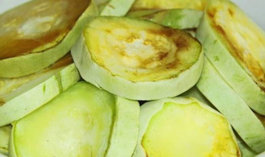 - We wassen de courgette zorgvuldig, snijden in plakjes en bakken 20 minuten in een voorverwarmde oven op 180 graden.