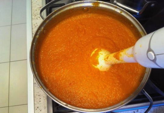 Maal de massa vervolgens met een blender en breng deze terug naar de pan.