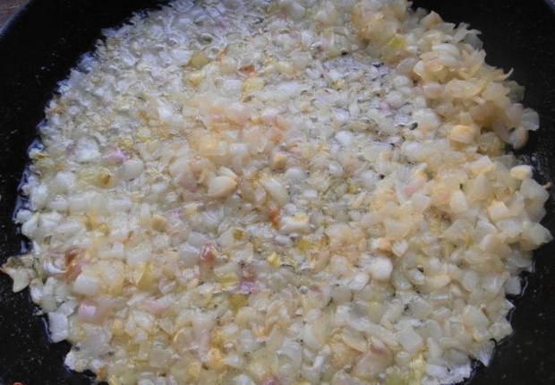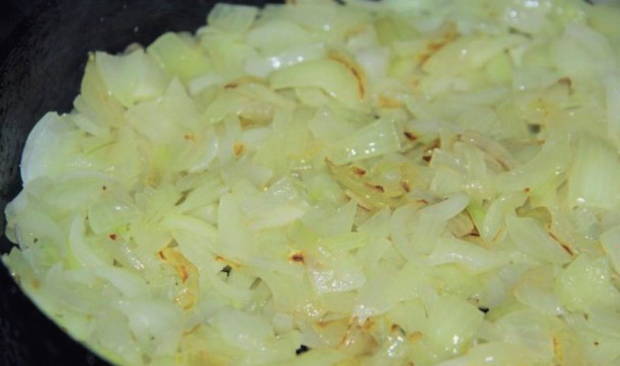 - Bak gehakte uien in plantaardige olie.