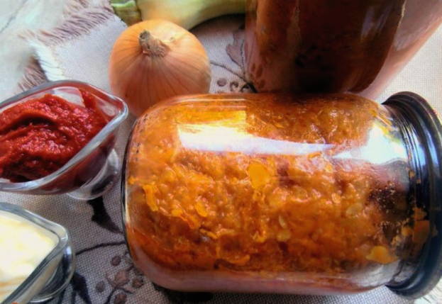 Courgettekaviaar voor de winter met mayonaise, tomatenpuree, wortel en ui