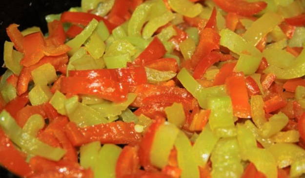 - Snijd de paprika's in reepjes en laat ze ook sudderen.
