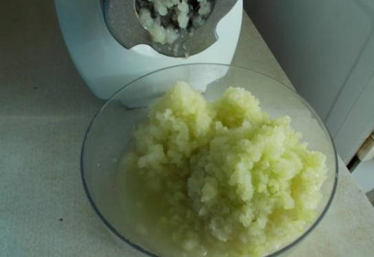 - Haal de gebakken uien door een vleesmolen.