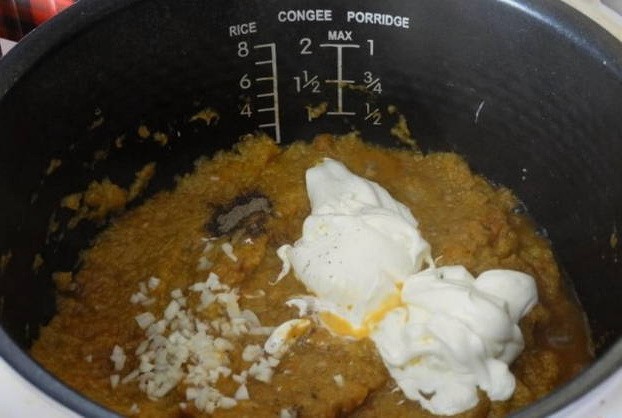 - Voeg gehakte knoflook, gemalen peper en mayonaise 30 minuten voor het koken toe.