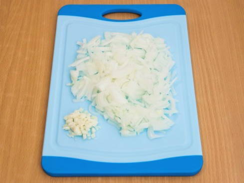 - Pel de ui en knoflook en hak ze fijn.