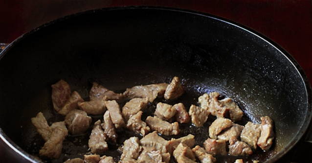 - Was het vlees en snij in kleine blokjes. Bak het vlees in plantaardige olie goudbruin.