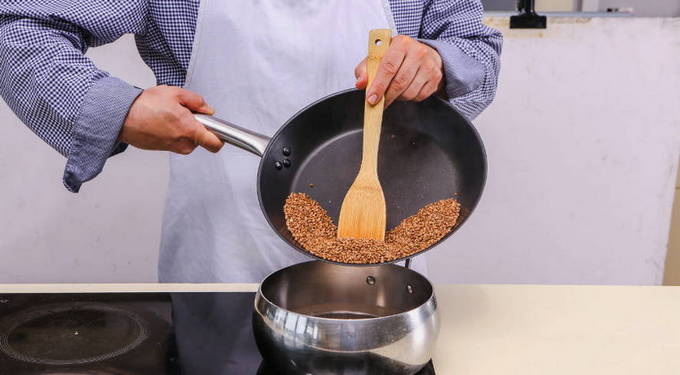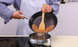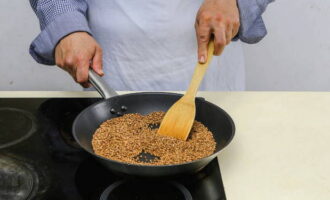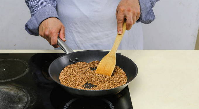Verwarm een koekenpan voor, leg er boekweit op en bak 4-5 minuten.
