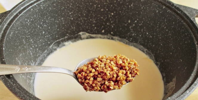 - Giet melk in een pan en breng aan de kook. Voeg dan boekweit toe.