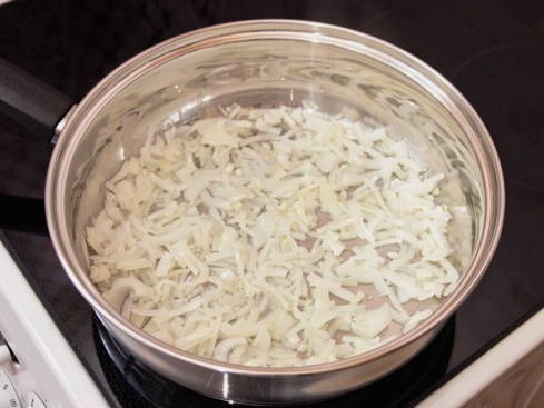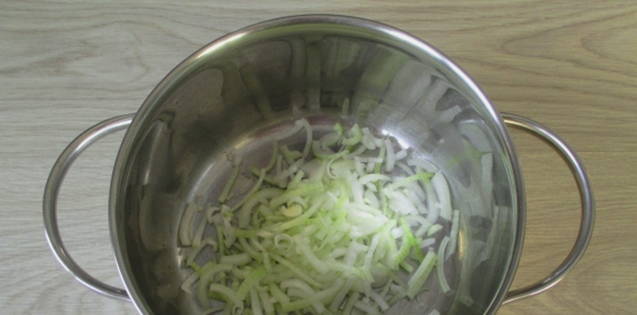 - Schil de ui, snijd in halve ringen en doe in een pan, bak de ui tot ze transparant is.