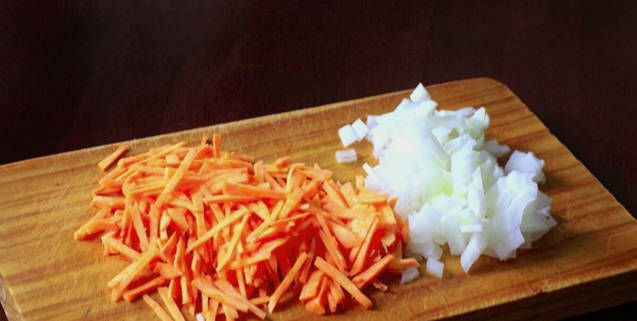 - Snijd de ui en wortel fijn.