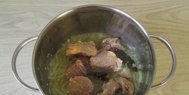 - Zet een pan op het vuur, doe er wat vet uit een blik gestoofd vlees in.