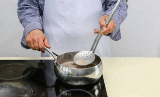 Schuim tijdens het koken het schuim af met een schuimspaan. Voeg als het water kookt plantaardige olie toe, zet het vuur lager en kook de pap gedurende 6-8 minuten.