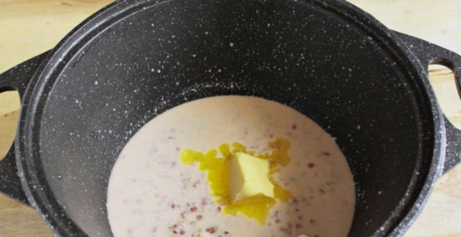- Voeg boter toe en kook de pap op middelhoog vuur, afgedekt gedurende 10-15 minuten.