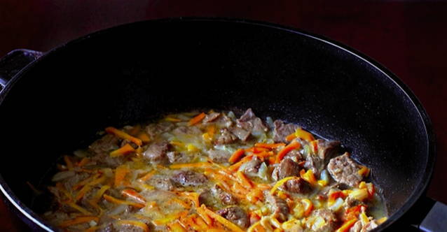 - Giet 100 ml heet water in een koekenpan en laat het vlees en de groenten op laag vuur sudderen tot het vocht verdampt is.