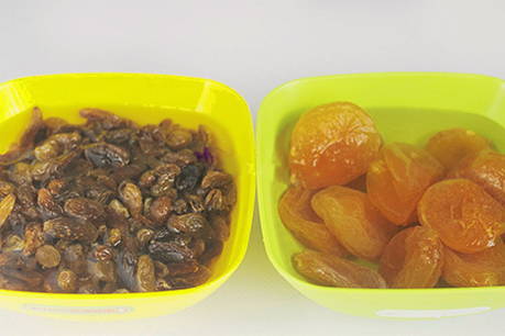 - Giet rozijnen en gedroogde abrikozen 5 minuten met warm water, spoel ze af met stromend water en droog ze af op keukenpapier.