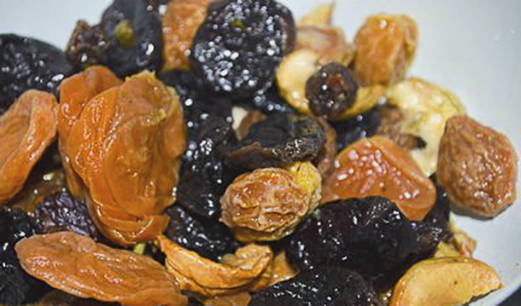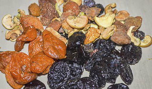 - Sorteer gedroogd fruit uit puin en was grondig.