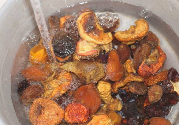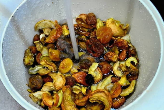 - Giet gedroogde vruchten een tijdje met water, spoel ze af en gooi ze weg in een vergiet.