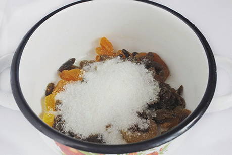 - Breng het gedroogde fruit over in een steelpan van geschikte grootte en bedek met suiker. Voor een zoetere drank, voeg meer suiker toe.