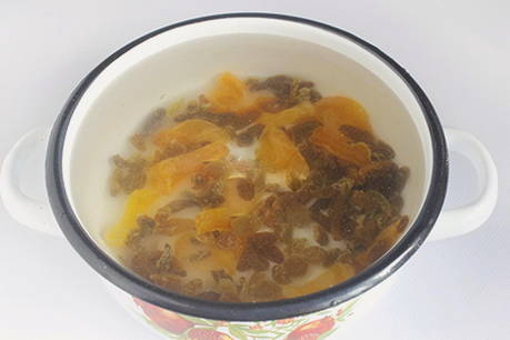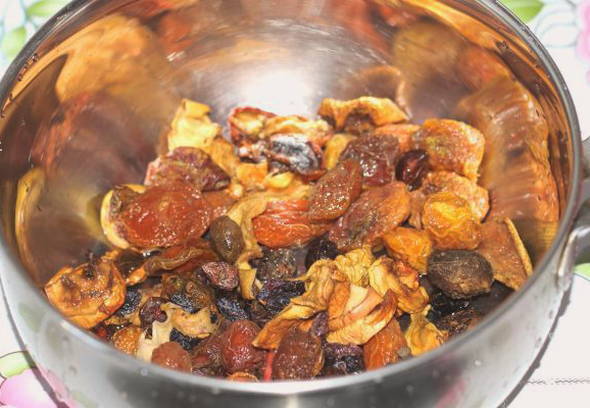 - U kunt naar wens een mengsel van gedroogd fruit kiezen. Giet de gedroogde vruchten 3-5 minuten met kokend water, was ze en gooi ze weg in een vergiet.