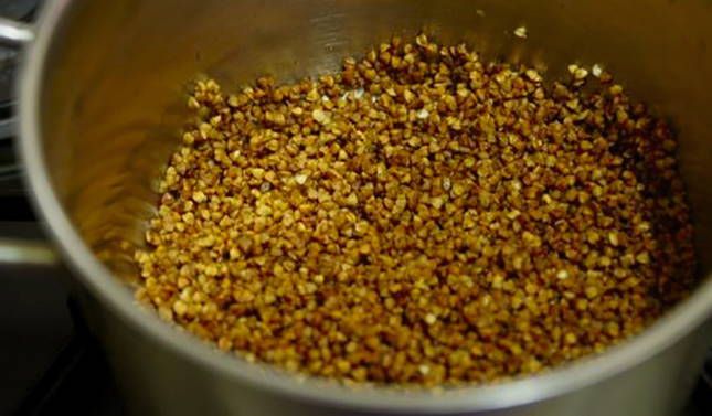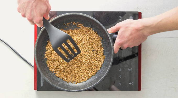 - Sorteer de boekweit, spoel af en verwarm in een pan tot het aroma begint af te geven.
