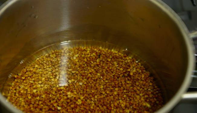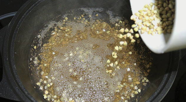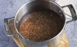 - Giet boekweit met water en zet op hoog vuur, breng het water aan de kook.