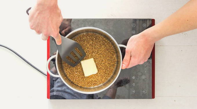 - Als de boekweit goed is ingedikt, voeg je de boter toe en dek je de pan af.