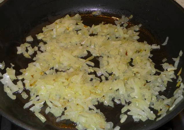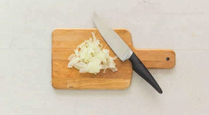 - Schil de ui, hak hem fijn en bak hem transparant in plantaardige olie.