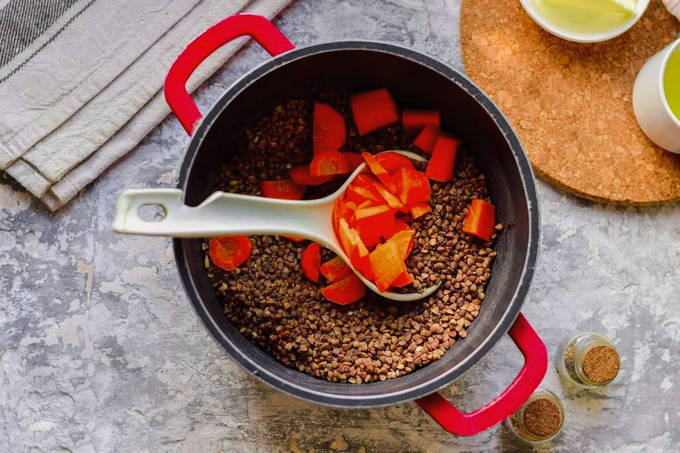 - Sluit vervolgens de pan goed af met een deksel, zet het vuur laag en kook 20-25 minuten verder. Boekweit moet al het water opnemen en klaar zijn.