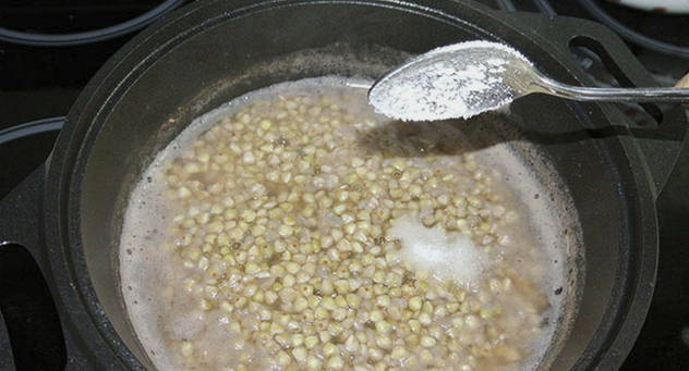 - Boekweit laten sudderen. Voeg zout naar smaak toe nadat het water bijna volledig is weggekookt.