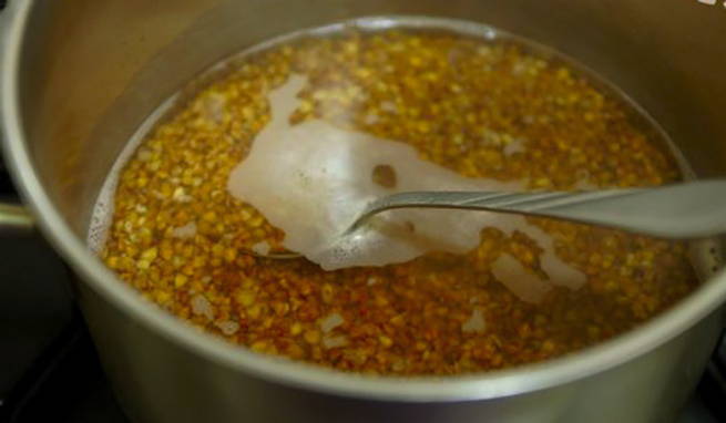 Giet het graan in een pan en plaats op het fornuis. Breng water aan de kook op hoog vuur, verwijder het schuim van het oppervlak.