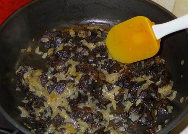 - Snijd de champignons in blokjes, voeg ze toe aan de pan met de uien en bak nog 5-7 minuten. Breng op smaak met zout en gemalen peper.