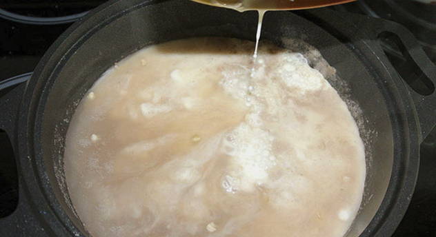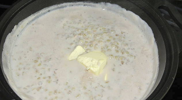 - Zet de pan op het vuur, breng aan de kook. Zet daarna het vuur laag, dek de pan af met een deksel en laat de pap 30 minuten sudderen. Boekweitpap is lekker en rijk.