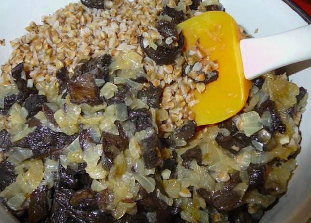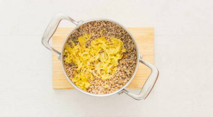 - Doe vervolgens de ui en champignons in een pan bakken bij de boekweitpap, roer.