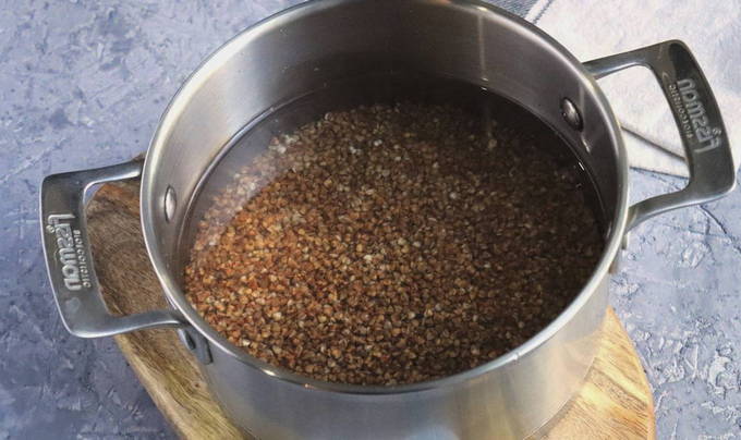 - Giet boekweit met water en zet op hoog vuur, breng het water aan de kook.