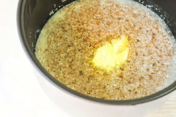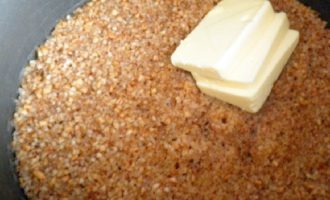 - Wanneer de multicooker het einde van de kookmodus aangeeft, voegt u olie toe aan de pap en sluit u het deksel gedurende vijf minuten. Gedurende deze tijd zal de pap een beetje trekken en sappiger worden.