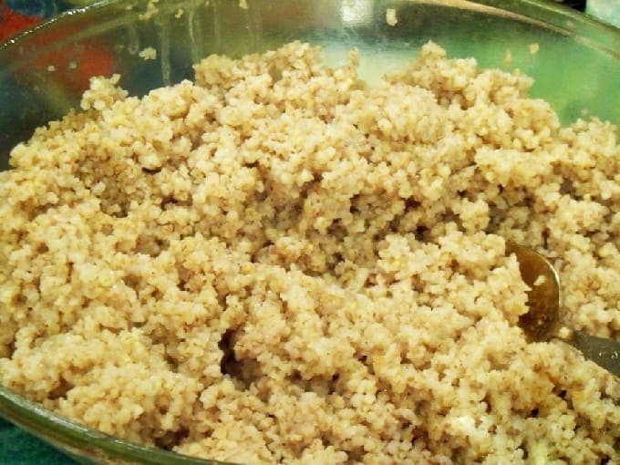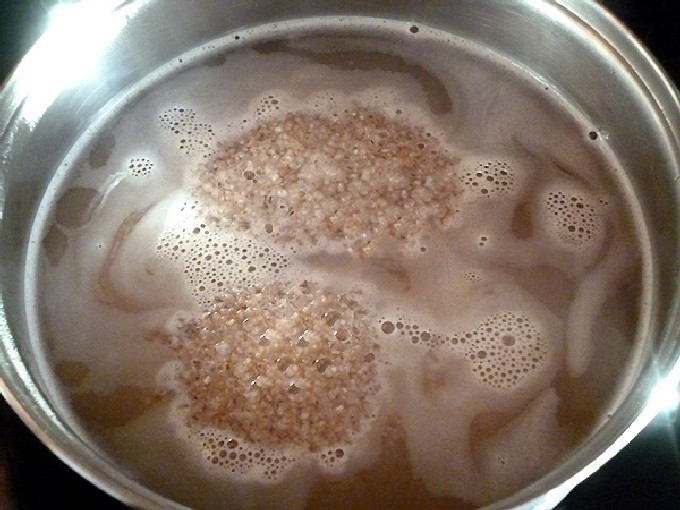 - Het graan moet worden gesorteerd, giet het dan in een kom en giet schoon koud water. Filter en spoel de granen dus totdat er schone granen in de kom zijn zonder vuil en kaf.