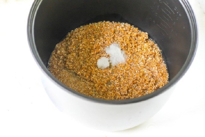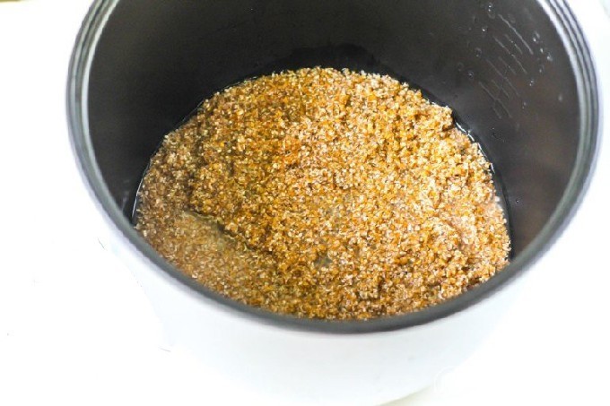- Doe schone gerstegrutten in een multikoker en strijk de bodem van de kom glad.