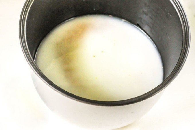 - Voeg heet water toe aan de kom van de multikoker en giet de melk erbij. Sluit het deksel van het apparaat en selecteer de modus "Pap" en stel de tijd in op 30 minuten. Open het deksel van het apparaat niet terwijl de pap kookt.