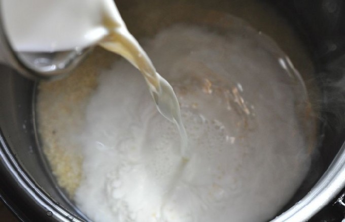 - Giet de melk geleidelijk in een pan met kokende gerstgrutten, voeg suiker toe, roer de pap en dek de pan af met de pap met een deksel. Kook de pap op matig vuur tot alle vloeistof is opgenomen. Op het laatste moment kun je olie aan de pap toevoegen.