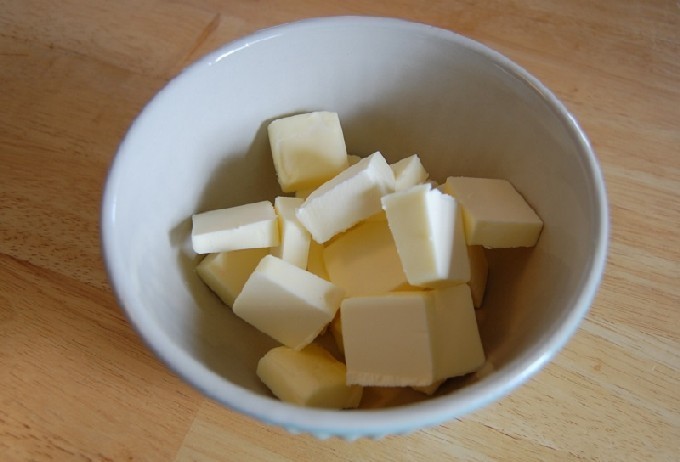 - Snijd het gewenste stuk boter af en doe het in een pan met de voorbereide hete pap.