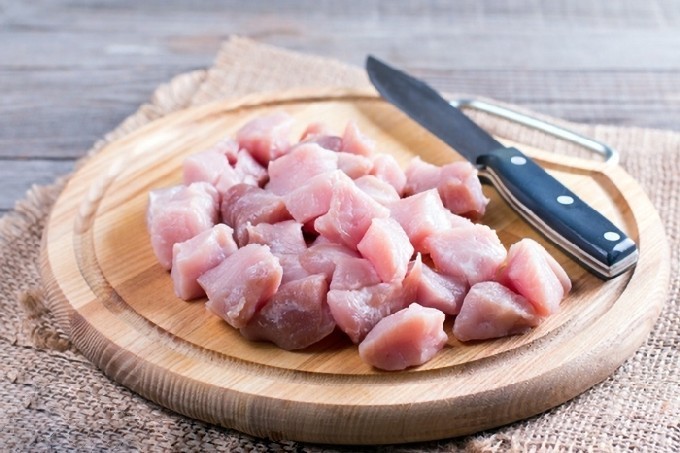- Spoel vers vlees, verwijder films en overtollig vet.Snijd het vlees daarna in kleine nette blokjes en droog het een beetje af met keukenpapier.