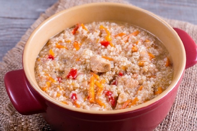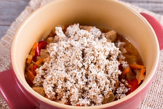 - Voeg de gerst toe aan de container met vlees en groenten, giet er twee glazen heet water in en laat twintig minuten onder het deksel sudderen.