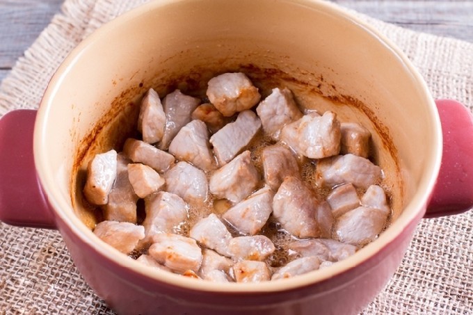 - Giet plantaardige olie in een pan met dikke bodem of pan met dikke bodem en verwarm deze. Dompel de stukken vlees erin en bak deze op hoog vuur tot er een goudbruin korstje ontstaat.