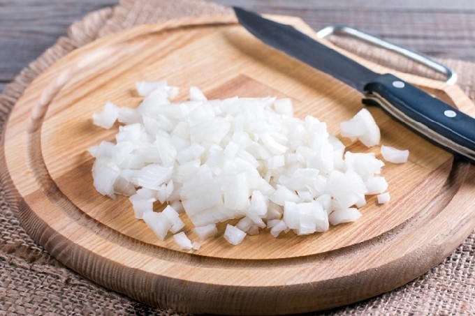 - Terwijl het vlees kookt, schil en spoel de ui. Snijd het in blokjes of reepjes - naar uw smaak.