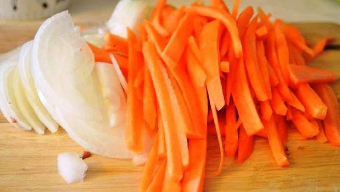 - Terwijl de pap kookt, schil, spoel en hak de uien en wortelen. U kunt kleiner of groter snijden - naar uw smaak.