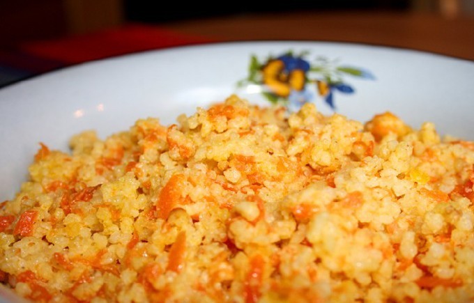 - Als de pap klaar is, voeg je de gebakken wortelen en uien toe aan de pan, roer je en laat je het tien minuten trekken. Serveer het afgewerkte gerecht vervolgens alleen of als bijgerecht op tafel.