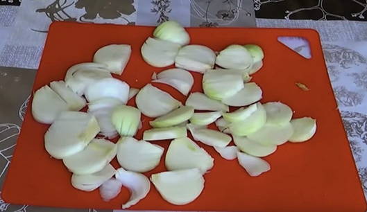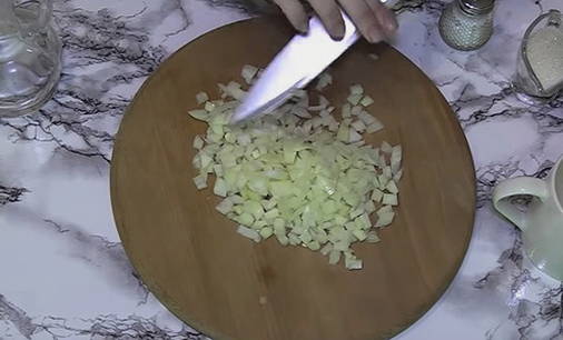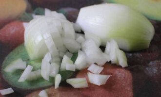 - Haal de schil van de ui, spoel hem af en snij in dunne ringen of halve ringen.