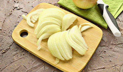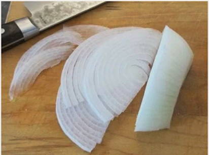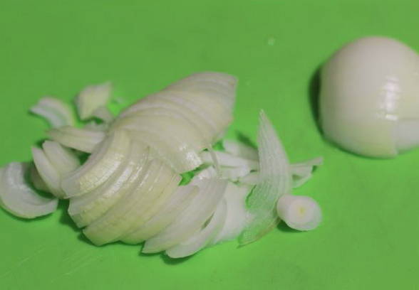 - Pel de ui en snijd hem in dunne halve ringen.