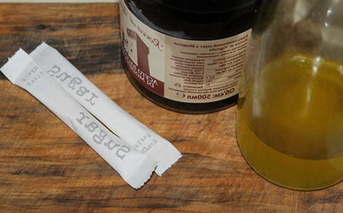 - Giet suiker en zout in een kom, giet er azijn in.