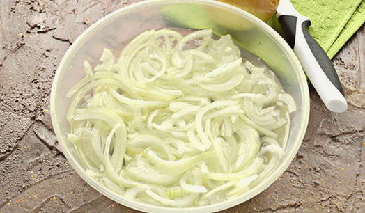 - Giet de ui met de resulterende marinade, deze moet volledig bedekt zijn met vloeistof. Sluit de container met uien en laat 40-60 minuten marineren.